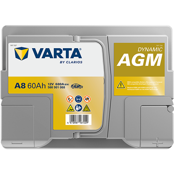 La batería de coche Varta A8 ExV AGM 60Ah 680A es la indicada para vehículos modernos con sistema Start & Stop, parada del motor automática cuando el vehículo se detiene, por ejemplo en los semáforos.
