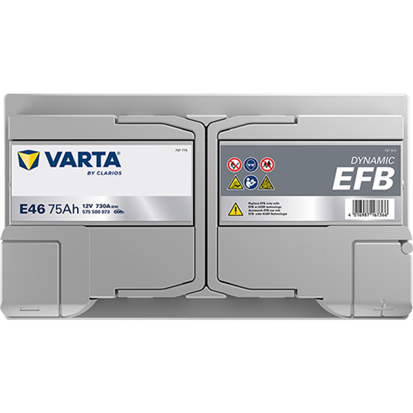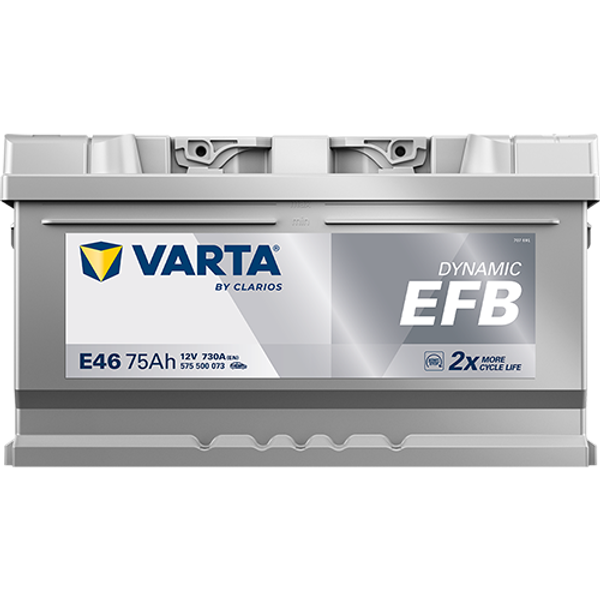 La batería de coche Varta EFB E46 EFB de 75 amperios y potencia de arranque de 730A es laadecuada para coches Ford con sistema Start & Stop, parada del motor automática cuando el vehículo se detiene, por ejemplo en los semáforos.